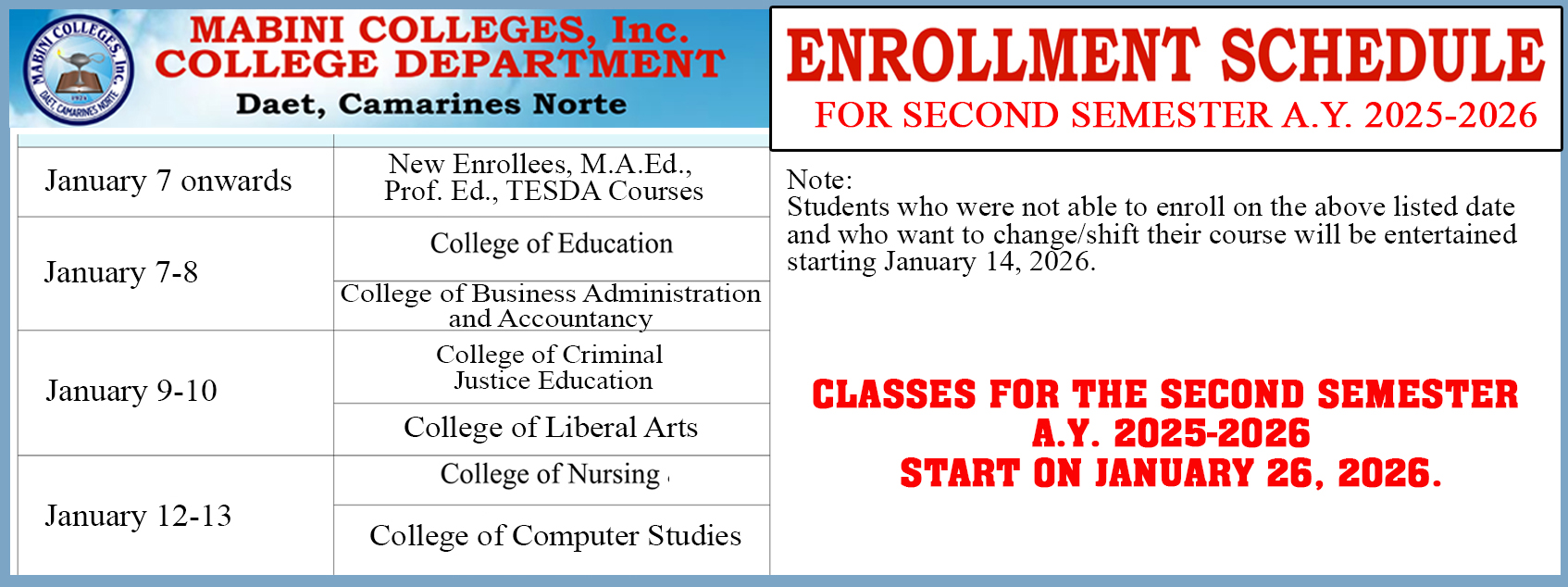 Mabini Colleges, Inc. is a private, non-sectarian institution of higher learning which is located along Governor Panotes Avenue in Daet, Camarines Norte.