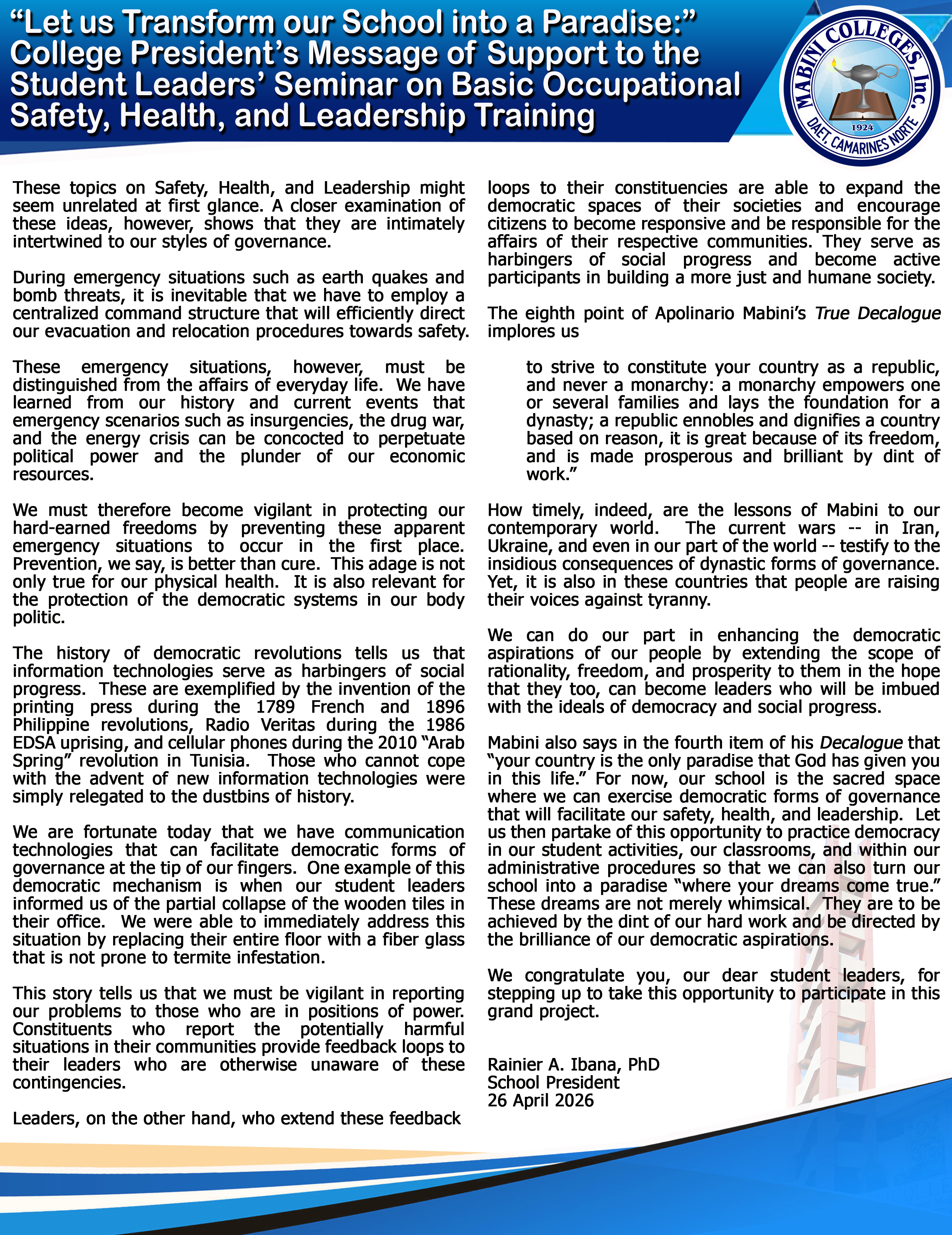 MABINI COLLEGES, INC.Governor Panotes Avenue,Daet, Camarines Norte,PHILIPPINESTel.: (054) 721–1281Fax: (054) 721-5743Email:mabinicollege@hotmail.com