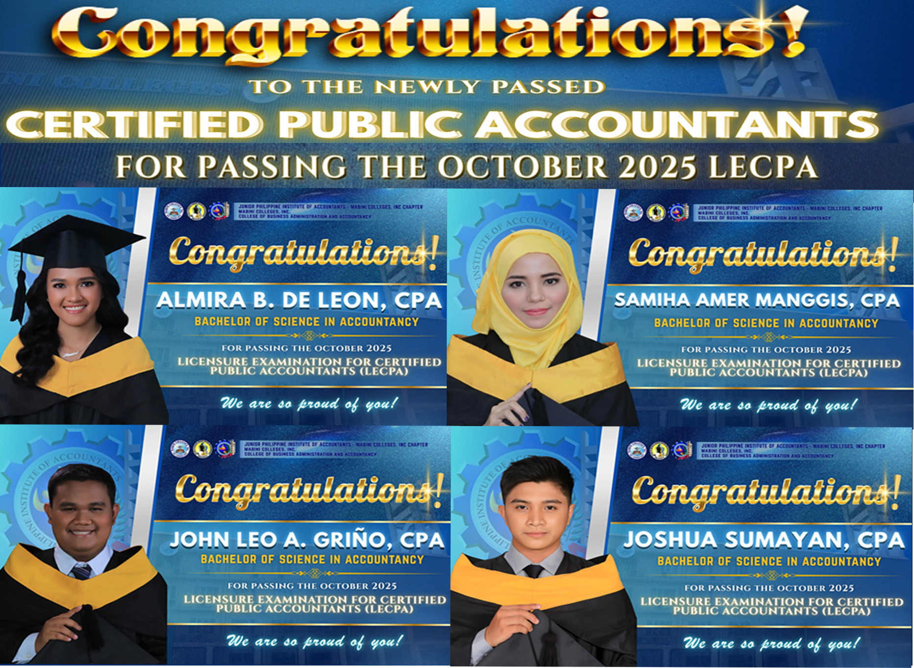 The tertiary level programs, degree and non-degree, are geared toward the pursuit of academic excellence and the internalization of Filipino values. These curricular programs are likewise directed towards upgrading the quality of college graduates as a means of increasing the percentage of qualifiers in the various licensure examinations.
