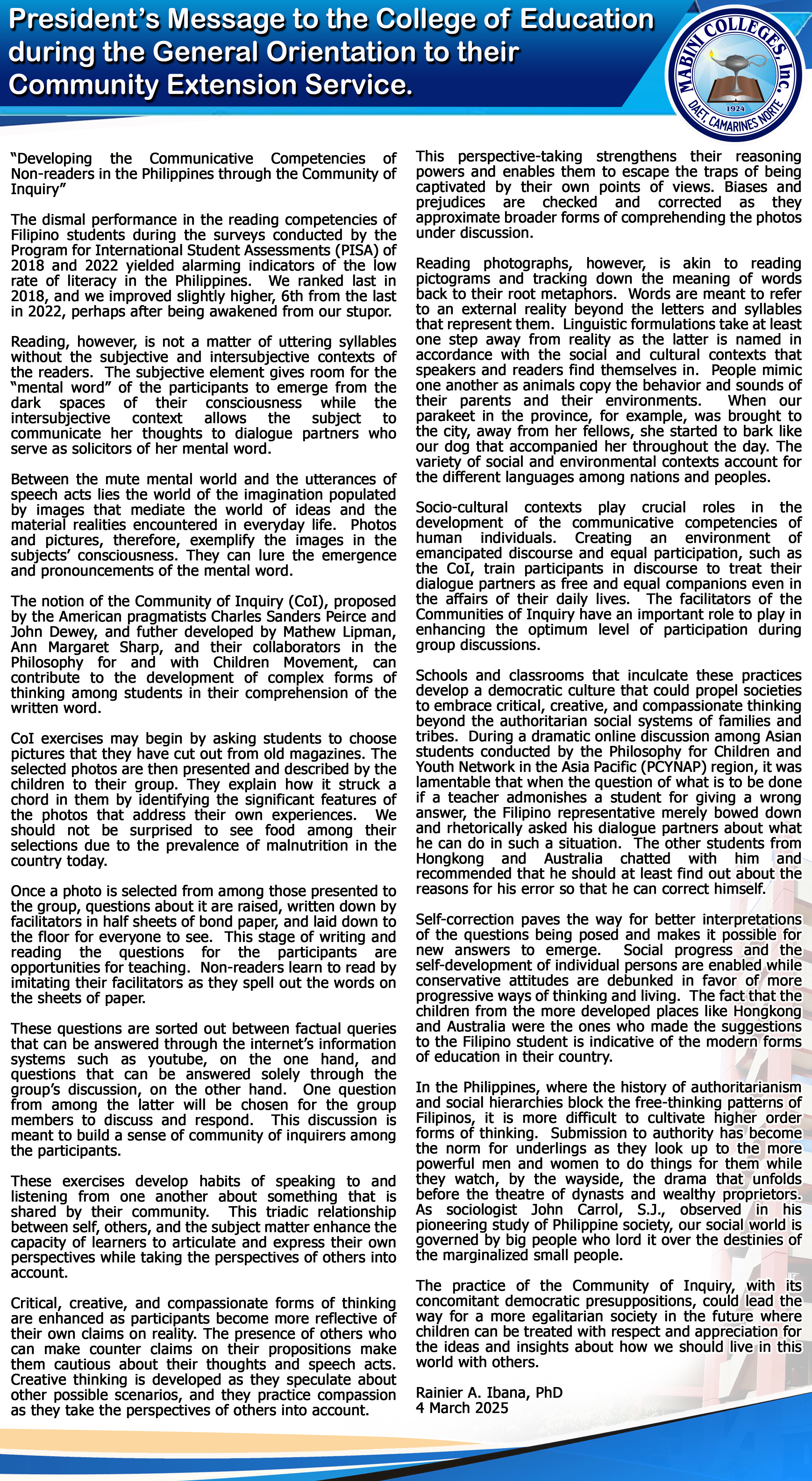 • A Graduation Message to the Mabini Colleges' Graduating Class of 2025