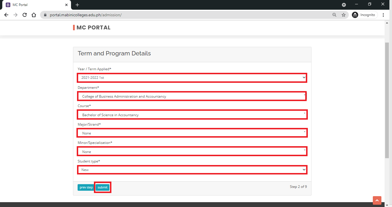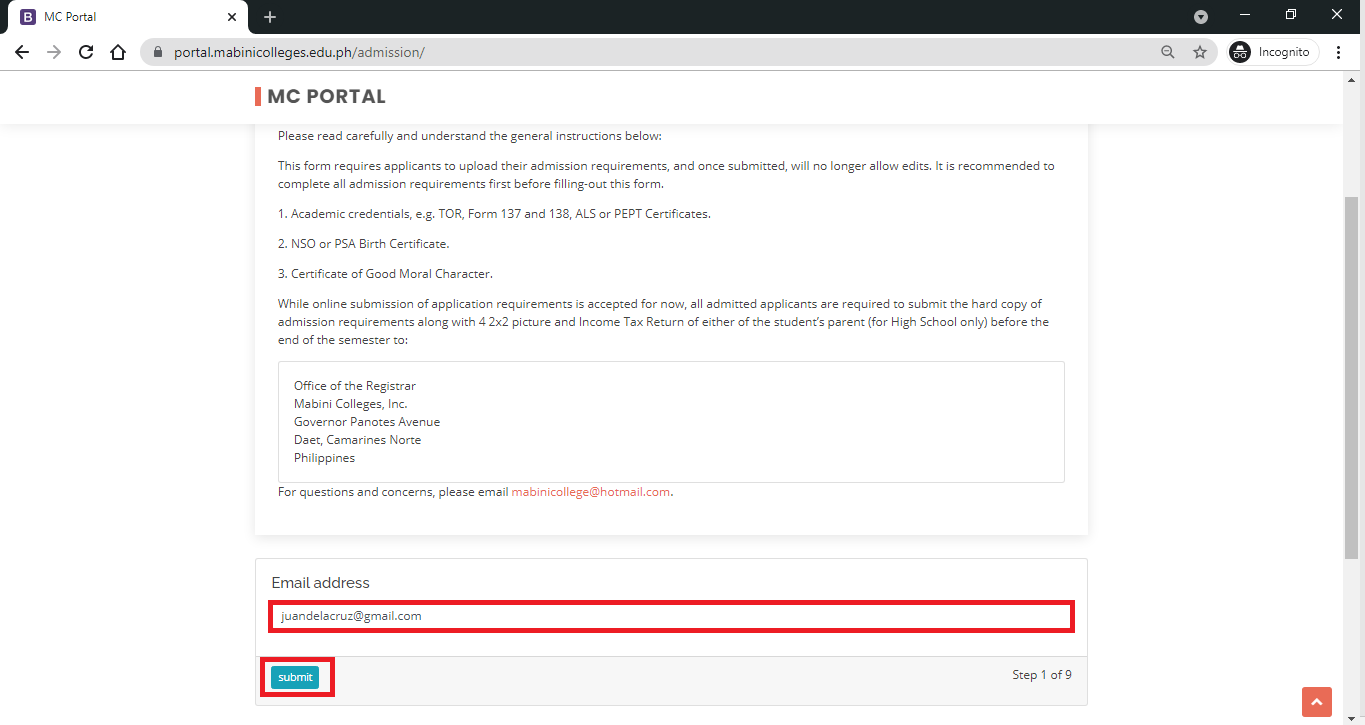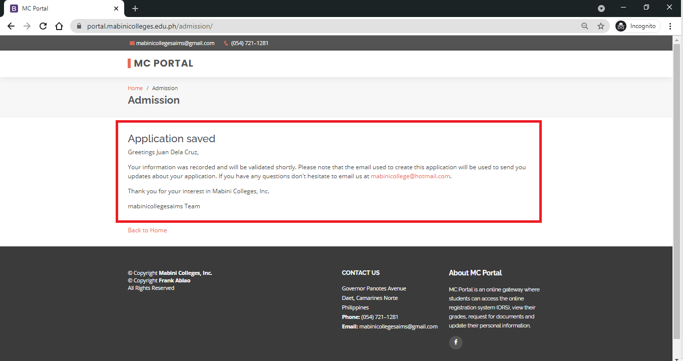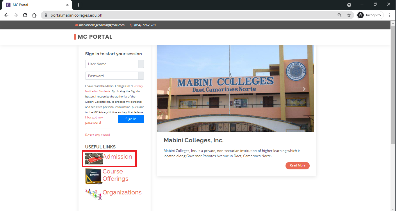 STEP 1. Go to MC student portal ( https://portal.mabinicolleges.edu.ph) and click the admission link.
