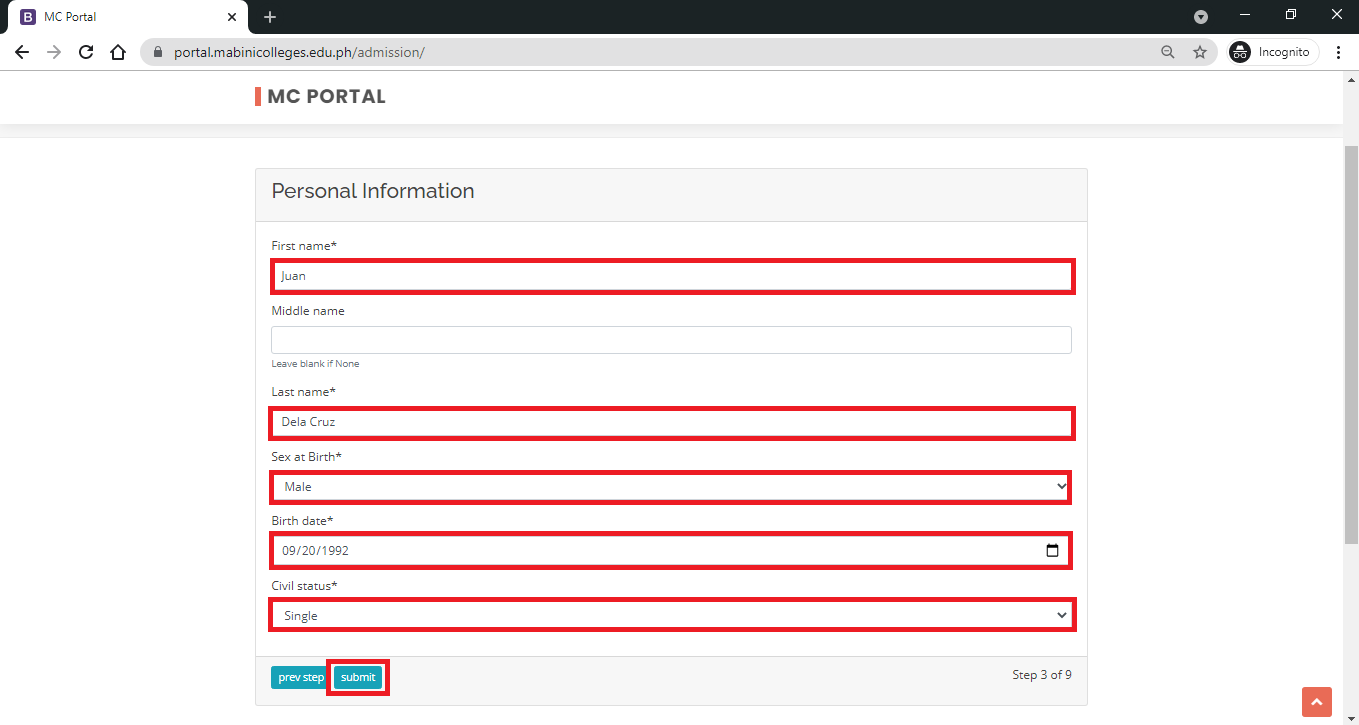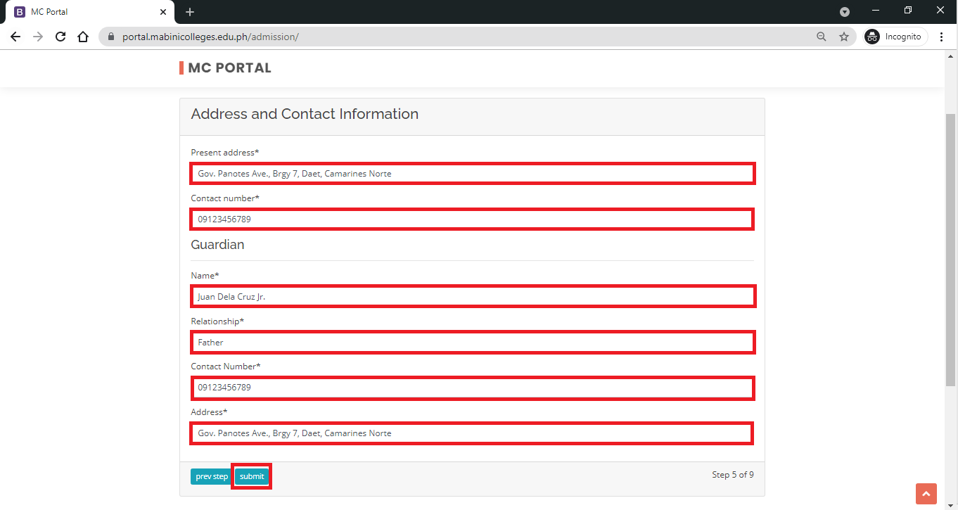 STEP 3. Key in/Input the required information then click submit. See the example below.