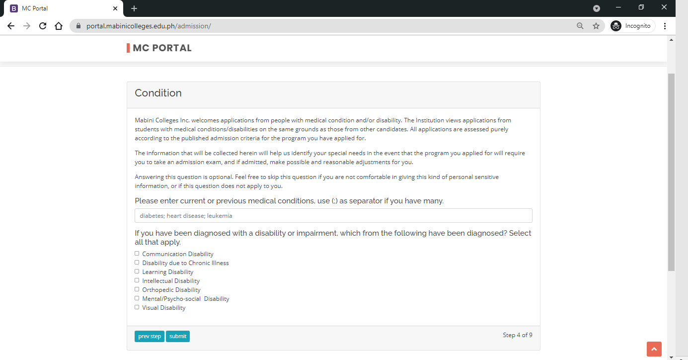 STEP 5. If you have been diagnosed with a medical condition or with disability, fill out the following fields then click