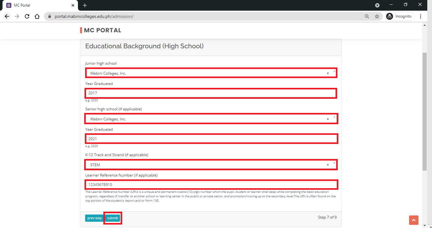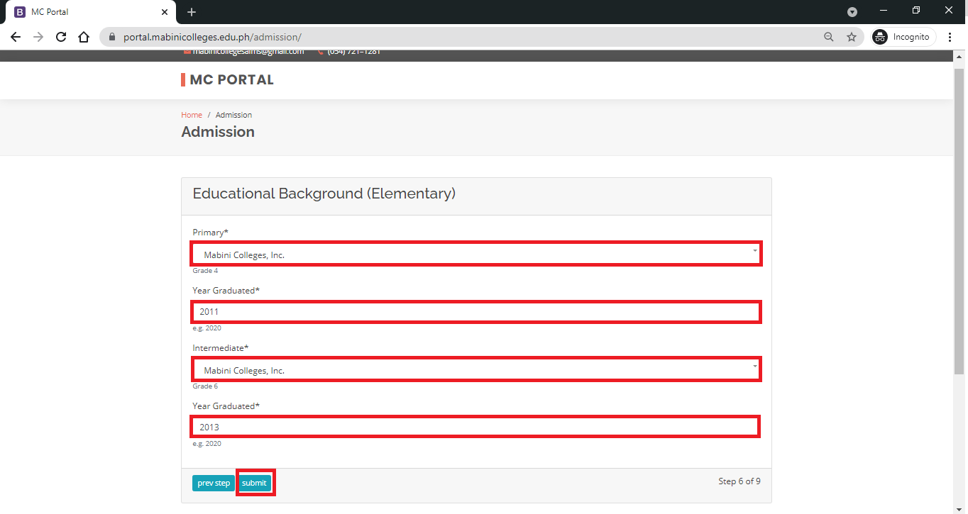 STEP 7. Key in/Input the Educational Background information then click submit.