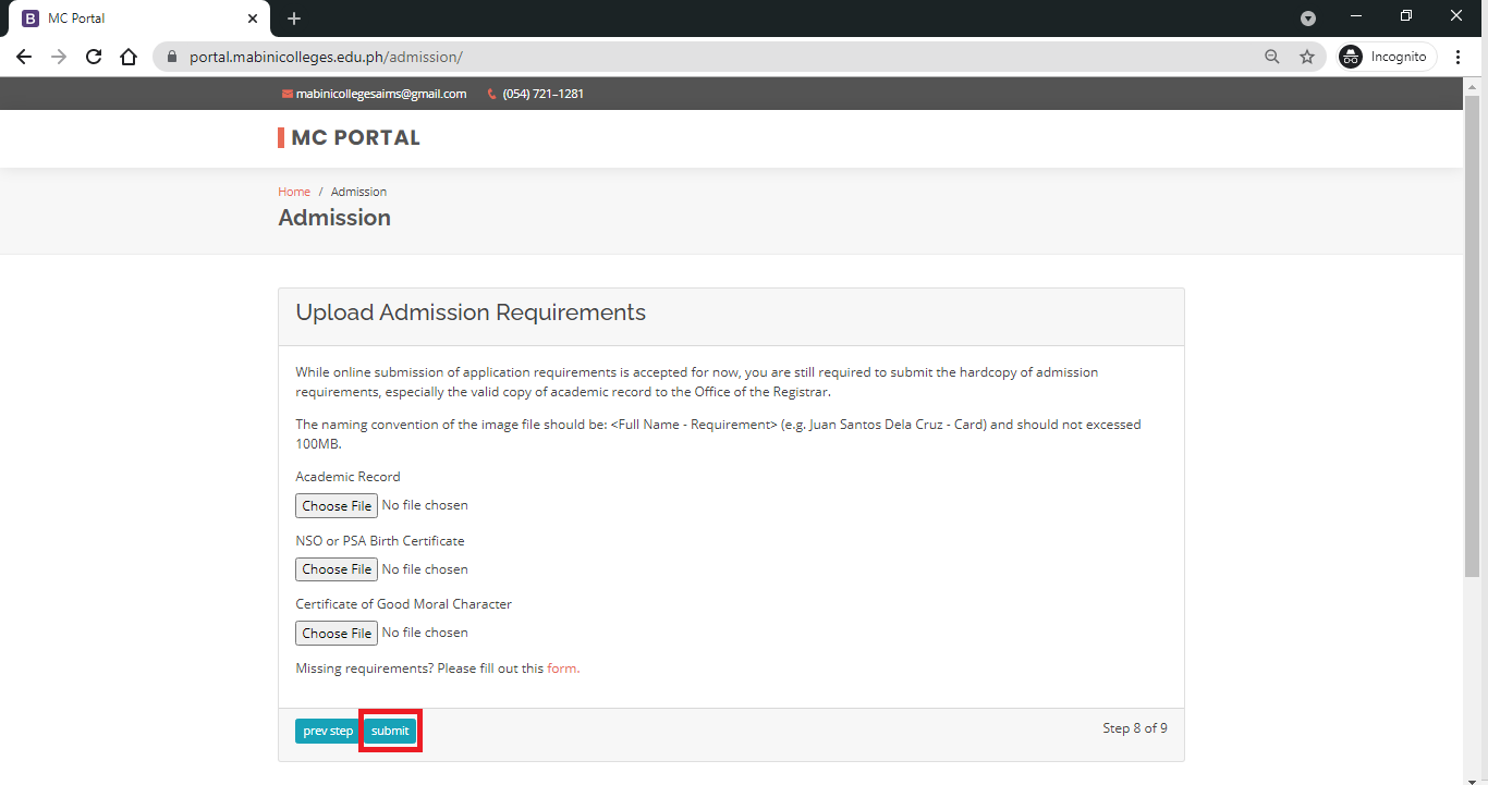 Note: Leave the upload of admission requirements blank if you have already submitted the requirements to the