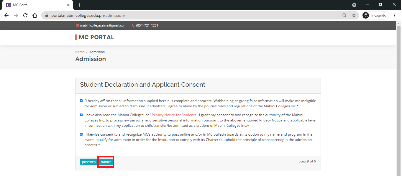 STEP 9. Read the Student Declaration and Applicant Consent, and upon agreement, check the boxes then click submit.