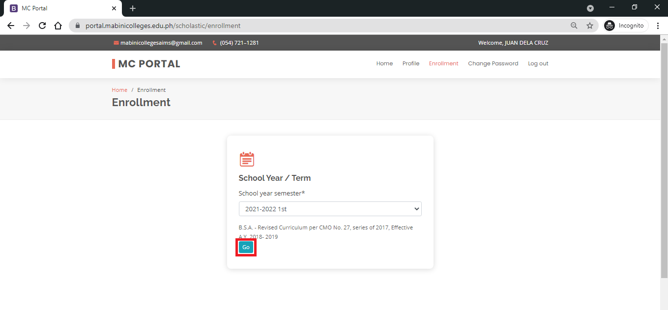 STEP 2. On the student portal click the Enrolment tab then select academic year/term you want to enroll then click Go