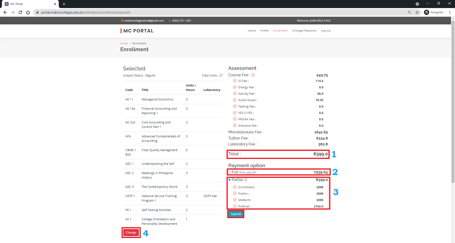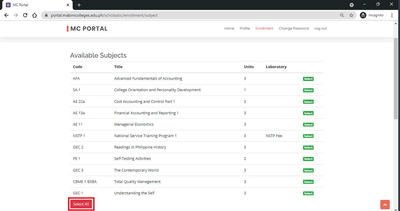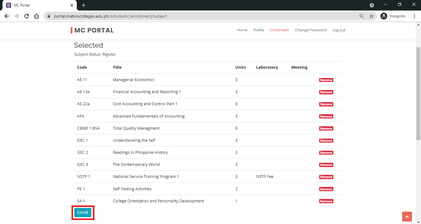 STEP 4. Check the subjects that you want to enroll then click Enroll Button.