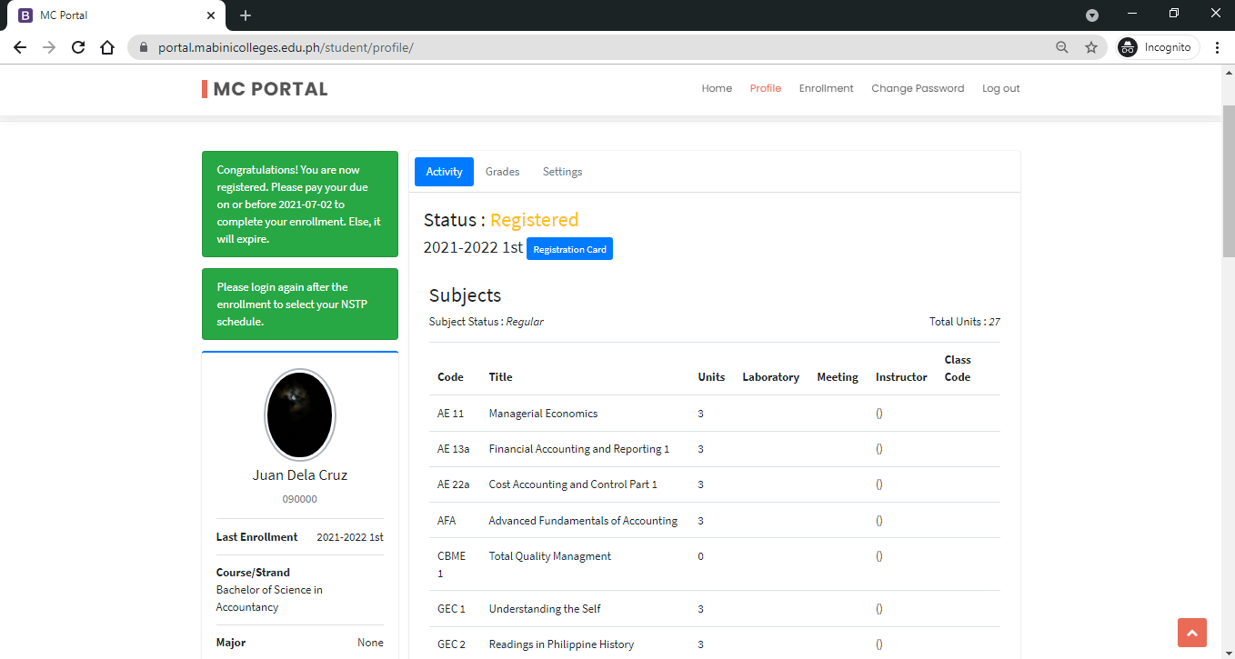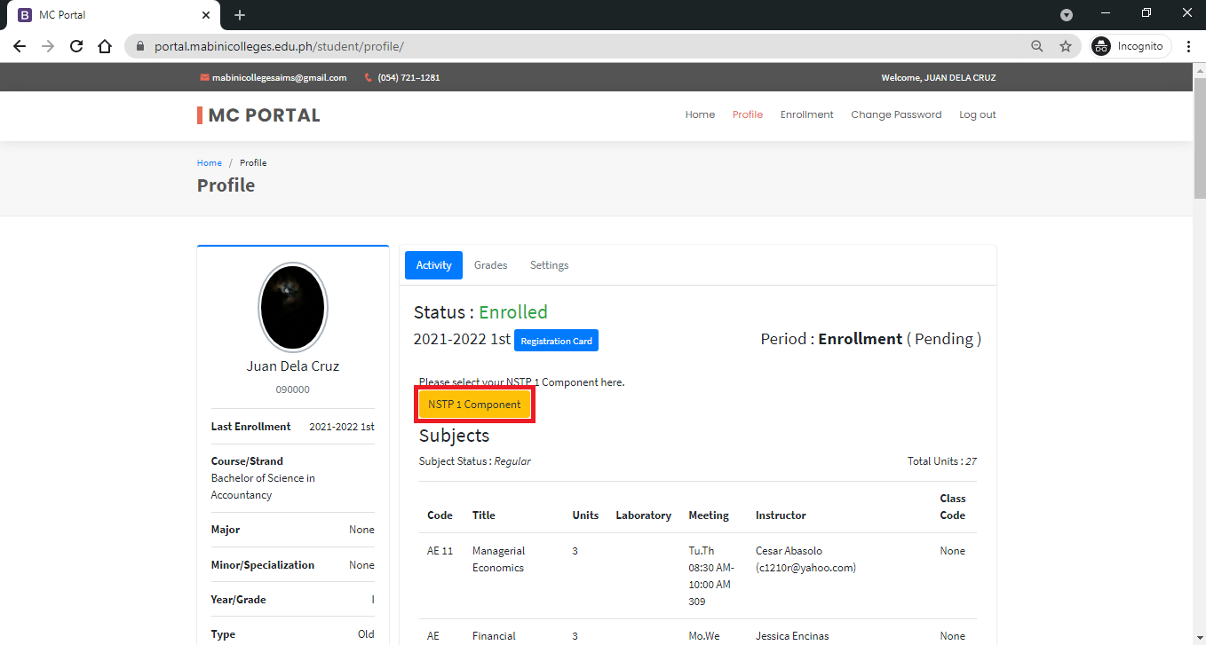 STEP 8. Access the MC Student Portal again to check the status of your enrollment and to view the subject schedule and