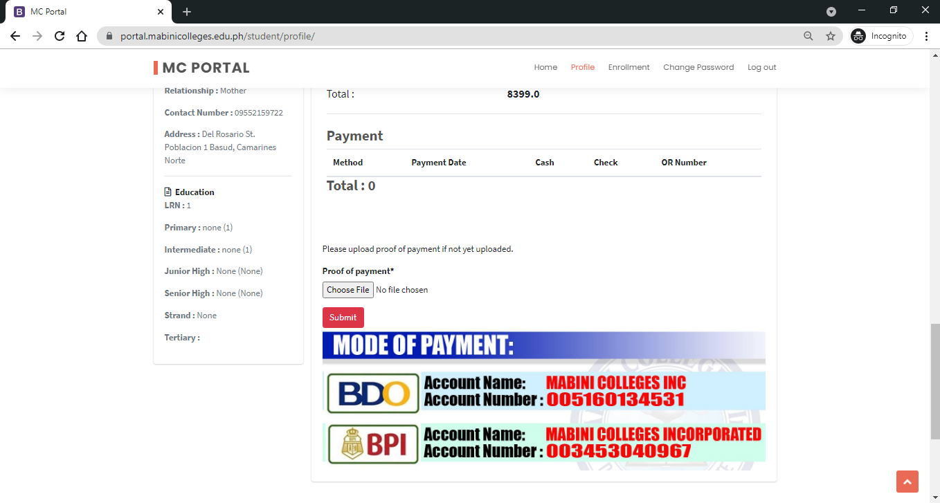 payment option, see step 7 and for the onsite payment, go to Cashier’s office and pay your installment/full tuition fee.