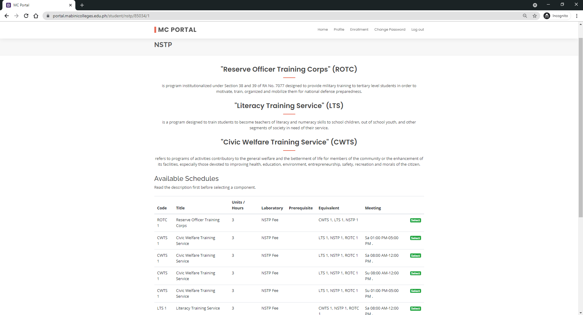 STEP 9: On the student portal, click NSTP 1 Component button then select only one component and schedule that you